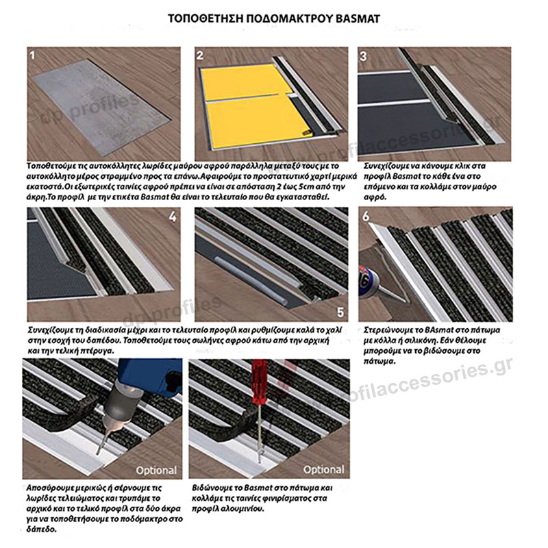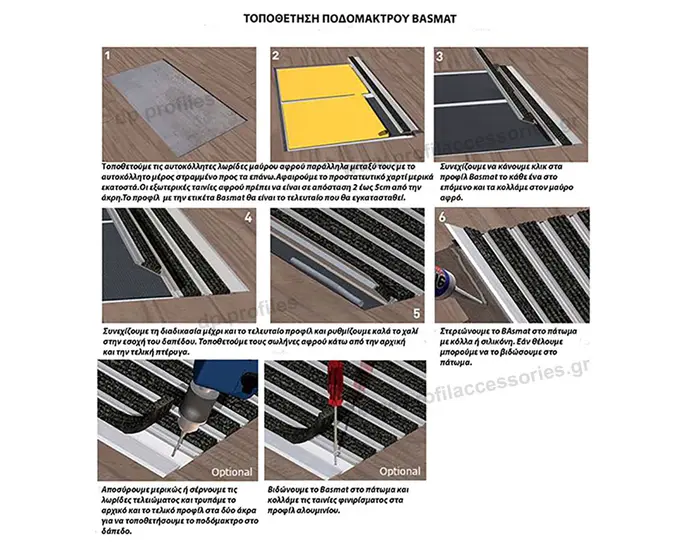 Το Basmat είναι μια ζώνη καθαρισμού εισόδου από προφίλ αλουμινίου με χαλί. Ο συνδυασμός των διαφορετικών υλικών δρα στην αποφυγή βρωμιάς.